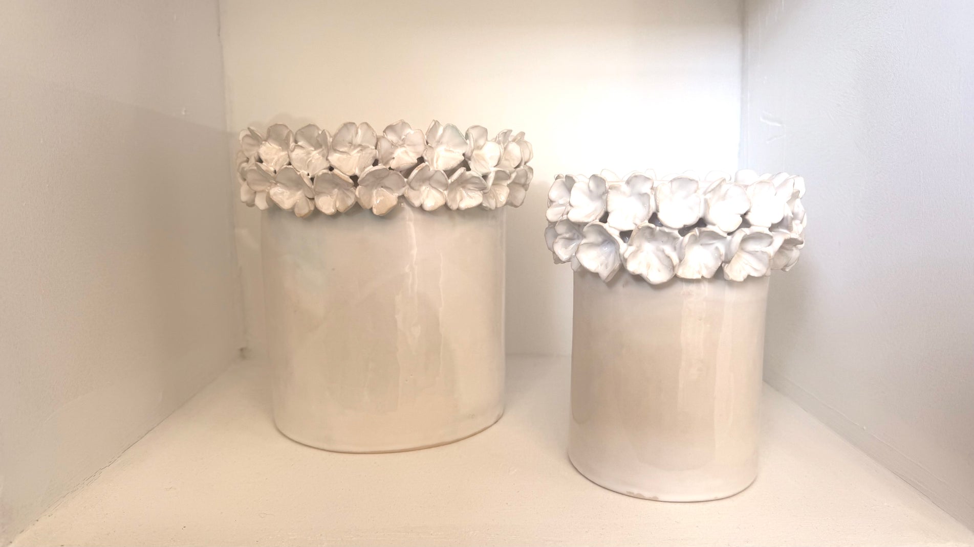 Ce vase en céramique blanche se distingue par une délicate couronne d’hortensias sculptés qui en habille tout le contour. Chaque pétale est posé à la main, apportant une touche poétique et aérienne à la pièce. Sa silhouette épurée, rehaussée de ces fleurs en relief, crée un contraste subtil entre sobriété...