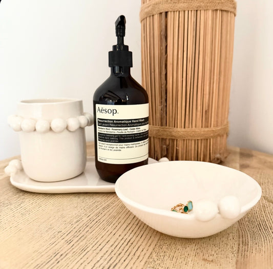 Le trio comprend un plateau, un gobelet à brosse à dents et une coupelle à bijoux. Chacune de ces pièces est délicatement ornée de petites perles en relief, qui courent en délicate couronne autour du bord. C’est un ensemble élégant, fait main, qui apporte une touche de luxe discret à...
