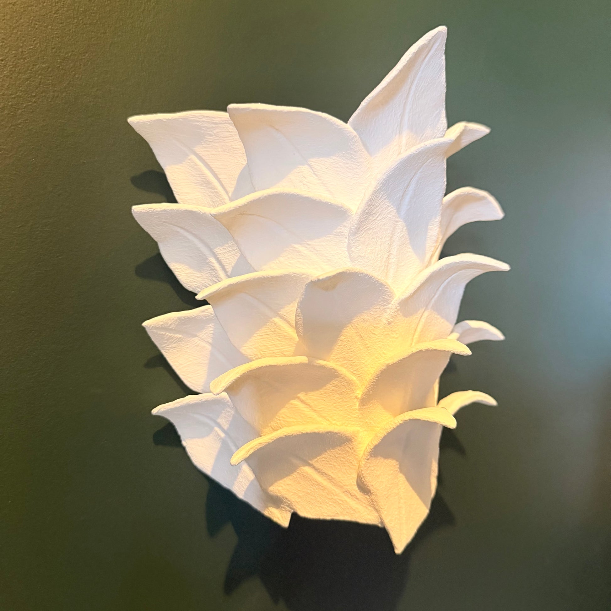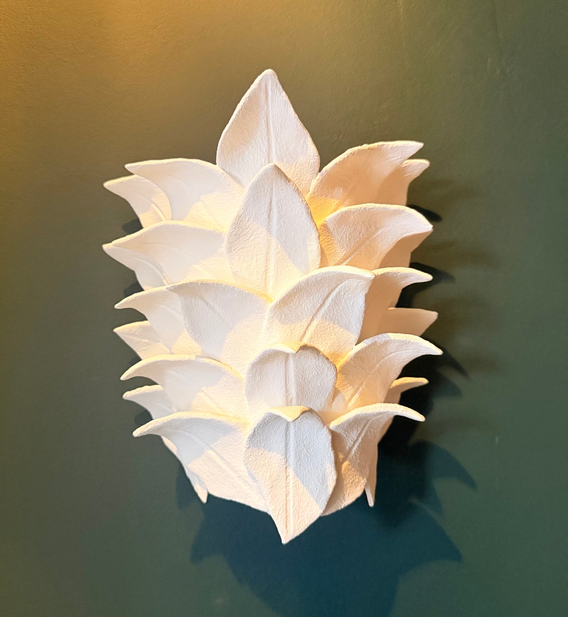 Une applique murale d’exception, sculptée en céramique et ornée de feuilles délicates. Chaque détail est peint à la main à la chaux, offrant une finition douce et lumineuse. Non électrifiée, elle se fixe simplement contre le mur, laissant l’ampoule cachée derrière diffuser une lumière subtile. Une pièce artisanale, poétique, qui sublimera vos espaces